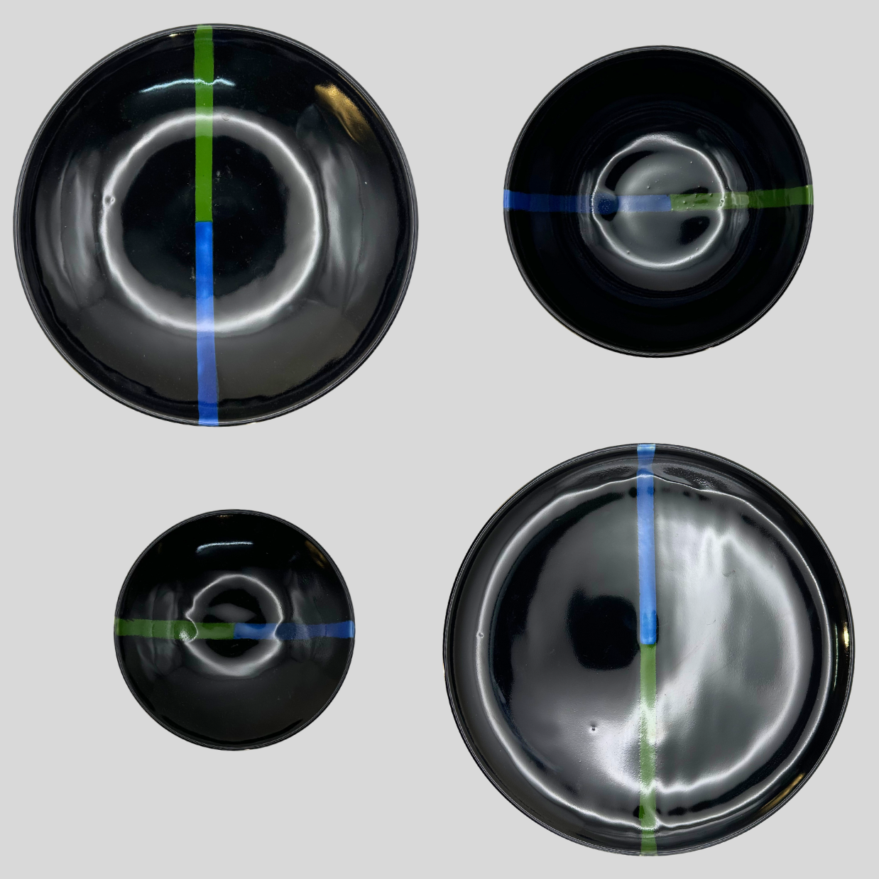 The Black stripe series embrace a splash of modern style with this striking ceramic plate. The sleek black base provides a sophisticated foundation for the eye-catching horizontal stripe. Formed by a delicate pairing of ocean blue and grassy green and red, this stripe adds a touch of playful flair without overwhelming the minimalist design. Perfect for adding a pop of personality to your table setting or as a decorative accent piece, this plate is sure to turn heads.